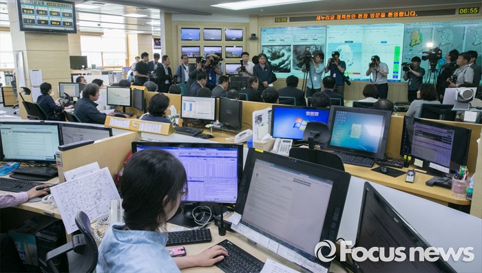 (서울=포커스뉴스) 미세먼지 대책과 관련해 현장 방문에 나선 정진석 새누리당 원내대표와 의원들이 1일 오후 서울 동작구 기상청 종합상황실을 방문해 관계자로부터 설명을 듣고 있다.
