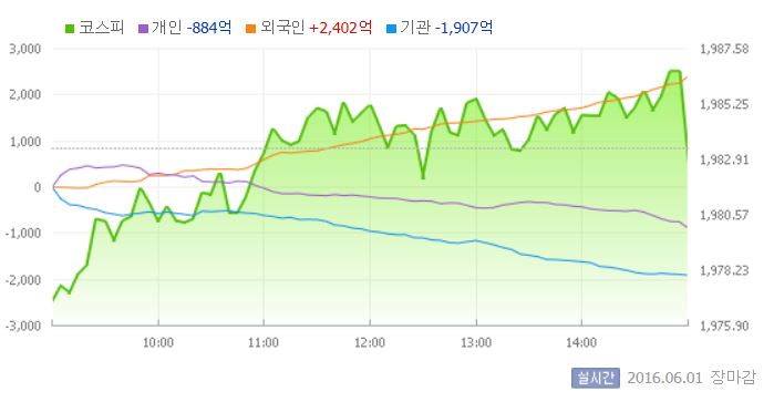이날 코스피는 전일대비 0.33% 하락한 1976.87에 장을 시작했다. 이후 지수는 기관의 매도 공세에 1980선 부근에서 하락세를 지속했다.