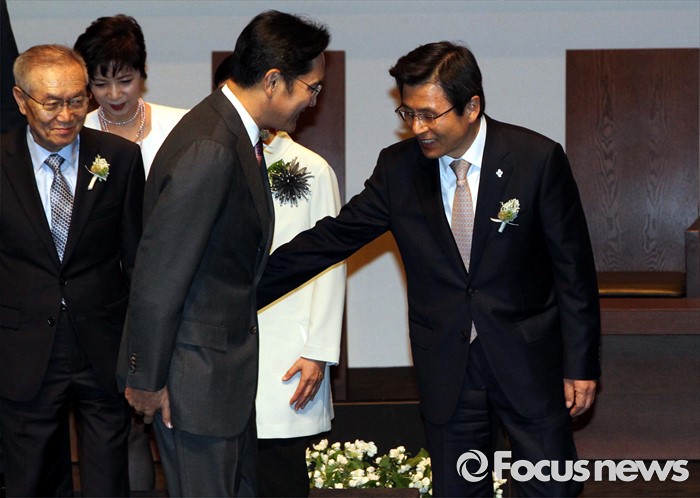 (서울=포커스뉴스) 1일 오후 서울 중구 호암아트홀에서 열린 제26회 호암상 시상식에 참석한 황교안 국무총리와 이재용 삼성전자 부회장이 인사하고 있다.