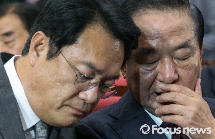 (서울=포커스뉴스) 2일 오후 서울 여의도 국회 의원회관에서 열린 새누리당 4차 전국위원회에 참석한 정진석(왼쪽) 원내대표와 서청원 전 최고위원이 대화하고 있다.