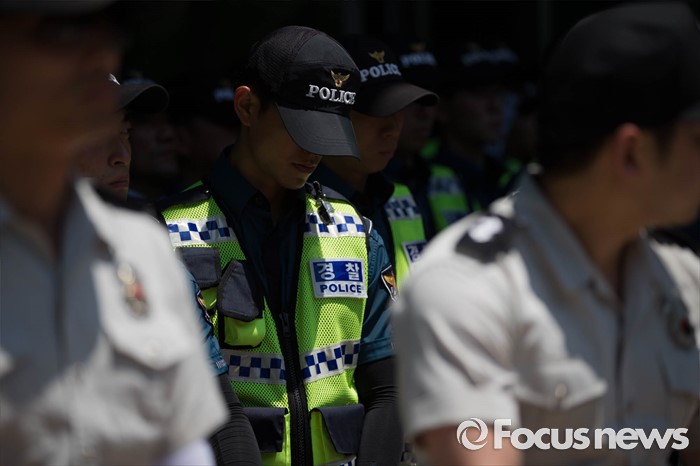 (서울=포커스뉴스) 2일 오후 서울 중구 서울시청 정문 앞에서 장애인부모연대원들이 발달장애인 정책수립을 촉구하며 삭발식을 하는 가운데 시청 정문을 지키는 경찰들이 고개 숙이고 있다.