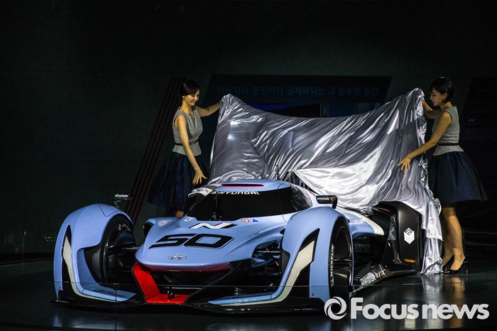 벡스코에서 열린 '2016 부산국제모터쇼'에서 현대의 순수 친환경 고성능 콘셉트카 'N 2025 그란 투리스모' 차량이 소개되고 있다.