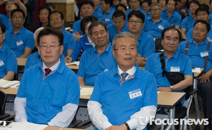 (괴산=포커스뉴스) 김종인 더불어민주당 비대위 대표가 1일 오후 충북 괴산 성불산자연휴양림에서 열린 충북도당 핵심당직자 워크숍에 참석하고 있다. 왼쪽은 이재명 성남시장.