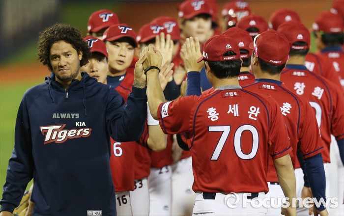 (서울=포커스뉴스) 1일 서울 잠실구장에서 열린 2016 프로야구 KIA-LG 경기에서 승리한 KIA 선수들이 코칭스탭과 하이파이브를 하고 있다. 투수 헥터는 7이닝 무실점으로 승리의 일등공신이 됐다.