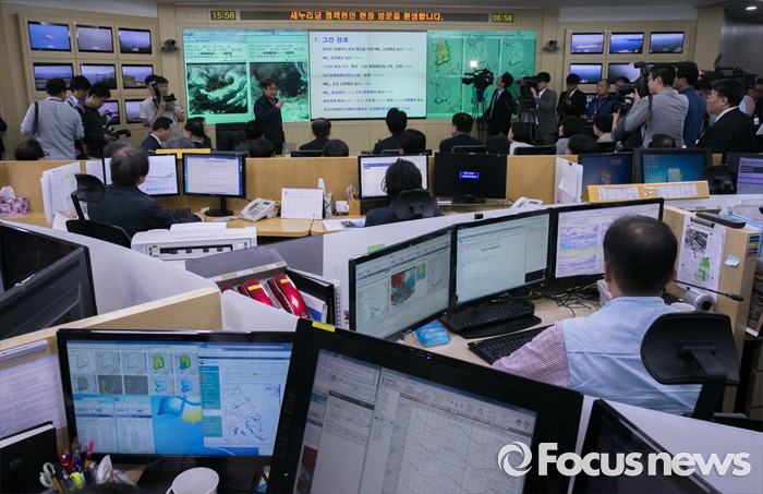 (서울=포커스뉴스) 미세먼지 대책과 관련해 현장 방문에 나선 정진석 새누리당 원내대표와 의원들이 1일 오후 서울 동작구 기상청 종합상황실을 방문해 관계자로부터 설명을 듣고 있다.