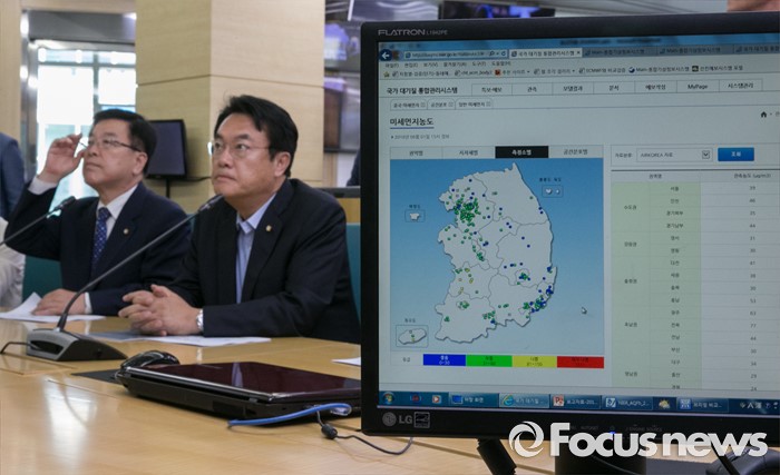 (서울=포커스뉴스) 미세먼지 대책과 관련해 현장 방문에 나선 정진석 새누리당 원내대표와 의원들이 1일 오후 서울 동작구 기상청 종합상황실을 방문해 관계자로부터 설명을 듣고 있다.