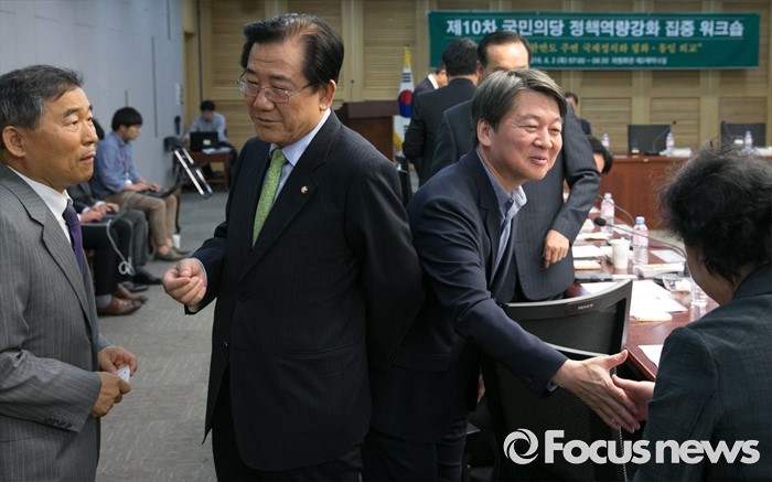 (서울=포커스뉴스) 2일 오전 서울 여의도 국회 의원회관에서 열린 국민의당 정책역량강화 집중 워크숍에 참석한 안철수 상임공동대표가 의원들과 인사하고 있다. 왼쪽부터 황주홍, 박준영 의원, 안 대표,