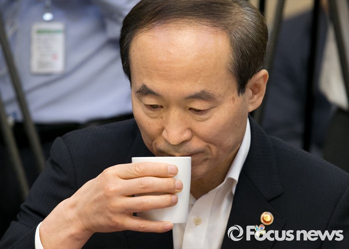 (서울=포커스뉴스) 2일 오전 서울 여의도 국회 귀빈식당에서 열린 미세먼지 대책 관련 당정협의에 참석한 윤성규 환경부 장관이 물을 마시고 있다.