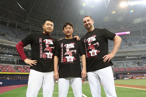 넥센은 올시즌 매월 선수 이미지가 담긴 티셔츠를 제작해 무료 배포하고 있다. 4월에는 서건창 티셔츠를, 5월에는 박동원 티셔츠를 각각 배포했다.프로야구 넥센이 1일 고척돔에서 열리는 삼성전에 앞서 관중에게 투수 피어밴드, 김상수, 김세현 이미지가 새겨진 티셔츠를 무료 배포하는 '영웅 프리티셔츠 데이' 행사를 연다. 김세현, 김상수, 피어밴드(왼쪽부터)가 무료 배포되는 티셔츠를 입고 포즈를 취하고 있다. <사진제공=넥센 히어로즈>