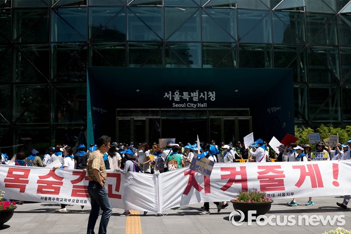 (서울=포커스뉴스) 2일 오후 서울 중구 서울시청 정문 앞에서 장애인부모연대원들이 발달장애인 정책수립을 촉구하며 삭발식 준비를 하고 있다.