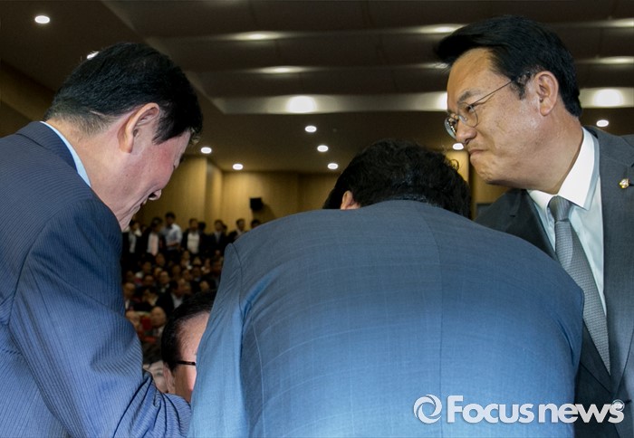 (서울=포커스뉴스) 2일 오후 서울 여의도 국회 의원회관에서 열린 새누리당 4차 전국위원회에 참석한 정진석(오른쪽) 원내대표와 최경환 의원이 인사하고 있다.