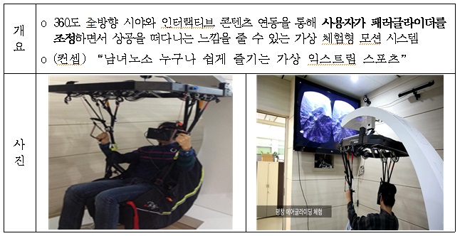 서석진 미래부 소프트웨어정책관은 “알파돔시티의 가상현실 테마파크를 통해 국민들이 도심에서 편리하게 체험할 수 있는 신(新)콘텐츠 서비스 창출을 주도하는 역할을 해주길 바란다”고 말했다.VR 연구개발물 중 하나인 에어글라이더.<사진제공=미래부>