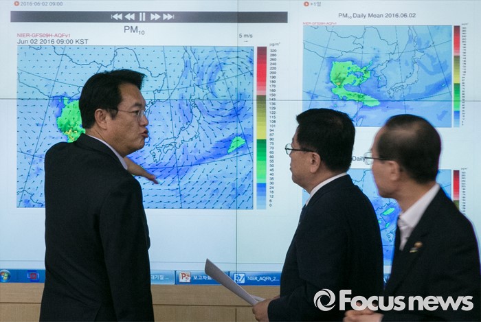 (서울=포커스뉴스) 미세먼지 대책과 관련해 현장 방문에 나선 정진석(왼쪽부터) 새누리당 원내대표, 김광림 정책위의장, 윤성규 환경부 장관이 1일 오후 서울 동작구 기상청 종합상황실을 방문해 현황을 살펴보고 있다.