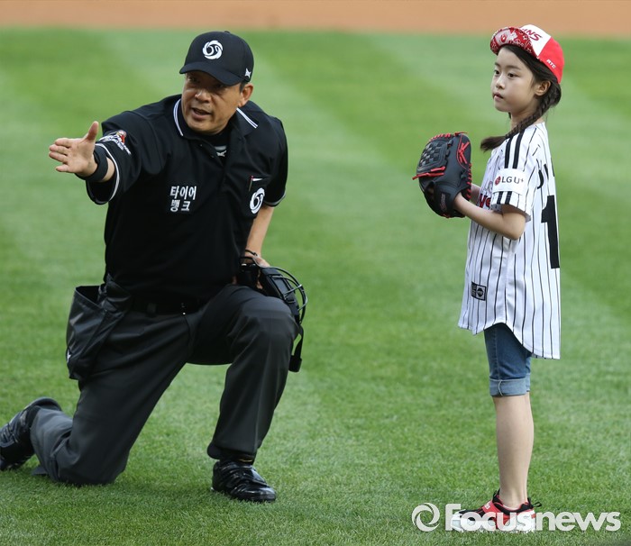 (서울=포커스뉴스) 1일 서울 잠실구장에서 열린 2016 프로야구 KIA-LG 경기에 앞서이민호 주심이 시구자 TV 드라마 '내딸 금사월'에 출연했던 아역배우 이나윤 어린이에게 플레이볼을 선언하고 있다.