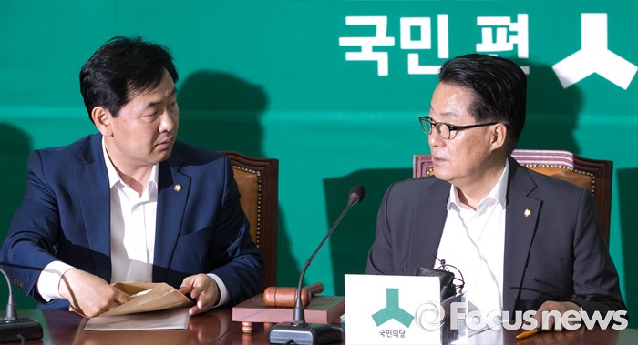(서울=포커스뉴스) 2일 오전 서울 여의도 국회에서 열린 국민의당 원내정책회의에 참석한 박지원(오른쪽) 원내대표, 김관영 원내수석부대표가 대화하고 있다.