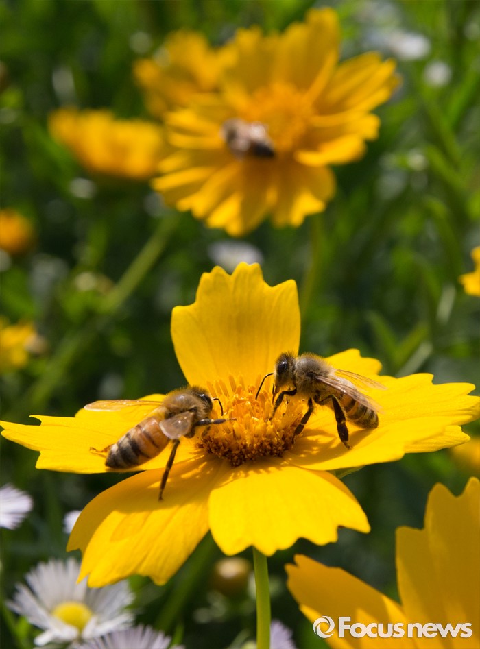 (충주=포커스뉴스) 2일 오후 충북 충주시 장성리 철도주변에 핀 금계국에서 꿀벌이 꽃가루를 채취하고 있다.
