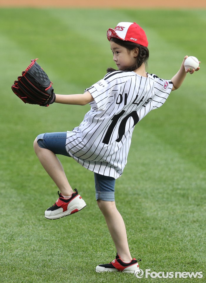 (서울=포커스뉴스) 1일 서울 잠실구장에서 열린 2016 프로야구 KIA-LG 경기에 앞서 TV 드라마 '내딸 금사월'에 출연했던 아역배우 이나윤 어린이가 시구하고 있다.