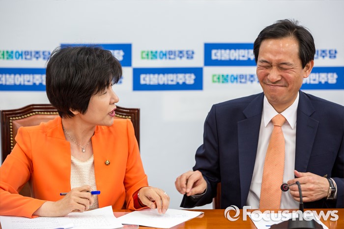 (서울=포커스뉴스) 우상호(오른쪽) 더불어민주당 원내대표가 2일 오전 서울 여의도 국회에서 열린 '가계부채 TF 발족식'에 참석해 김영주 가계부채TF 단장과 대화를 나누고 있다.