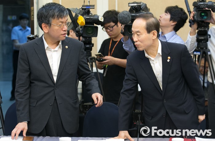 (서울=포커스뉴스) 2일 오전 서울 여의도 국회 귀빈식당에서 열린 미세먼지 대책 관련 당정협의에 참석한 윤성규(오른쪽) 환경부 장관과 최상목 기획재정부 1차관이 대화하고 있다.