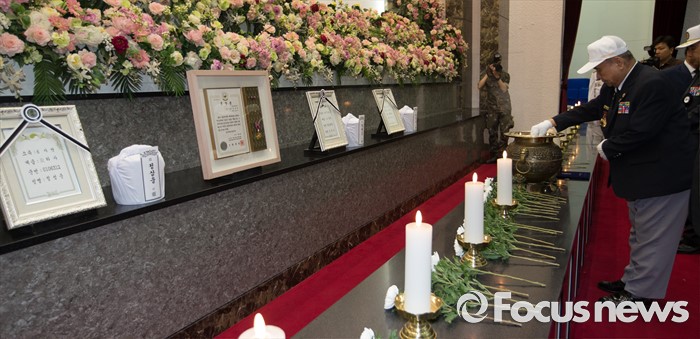 (대전=포커스뉴스) 2일 오전 대전 유성구 국립대전현충원에서 열린 6.25 전쟁 전사자 발굴유해 3위(位) 합동안장식에 참석한 참전용사가 분향하고 있다.