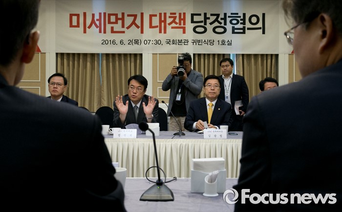 (서울=포커스뉴스) 2일 오전 서울 여의도 국회 귀빈식당에서 열린 미세먼지 대책 관련 당정협의에 참석한 정진석(왼쪽 두번째) 새누리당 원내대표가 모두발언을 하고 있다.