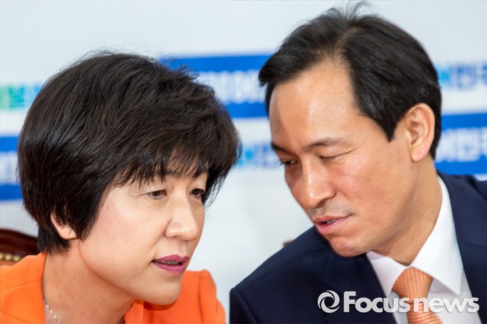 (서울=포커스뉴스) 우상호(오른쪽) 더불어민주당 원내대표가 2일 오전 서울 여의도 국회에서 열린 '가계부채 TF 발족식'에 참석해 김영주 가계부채TF 단장과 대화를 나누고 있다.