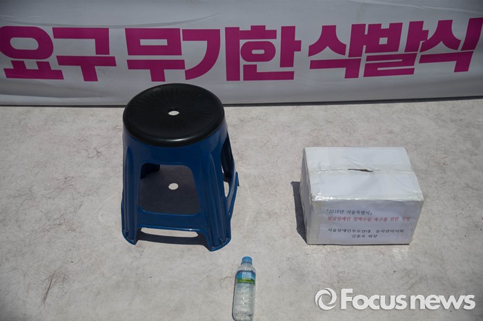 (서울=포커스뉴스) 2일 오후 서울 중구 서울시청 정문 앞에서 장애인부모연대원들이 발달장애인 정책수립을 촉구하며 삭발식을 준비하고 있다.
