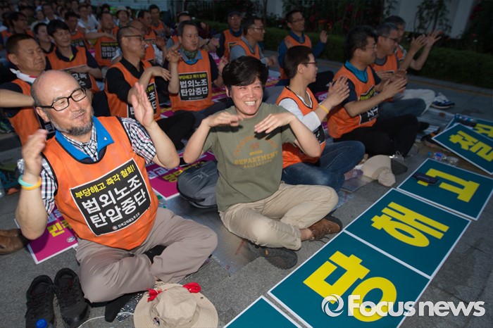 (서울=포커스뉴스) 전국교직원노동조합 조합원들이 1일 오후 서울 종로구 정부서울청사 앞에서 열린 '법외노조 탄압, 부당해고 규탄 48시간 집중행동 투쟁문화재'에서 부당해고 중단을 촉구하는 율동을 선보이고 있다.