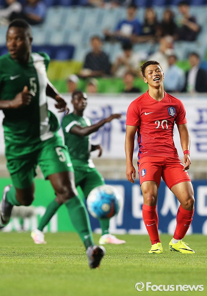 (수원=포커스뉴스) 2일 오후 경기 수원월드컵경기장에서 열린 2016 4개국 올림픽국가대표 축구대회 대한민국과 나이지리아의 경기에서 대한민국 황희찬이 볼을 놓친 후 아쉬워 하고 있다.