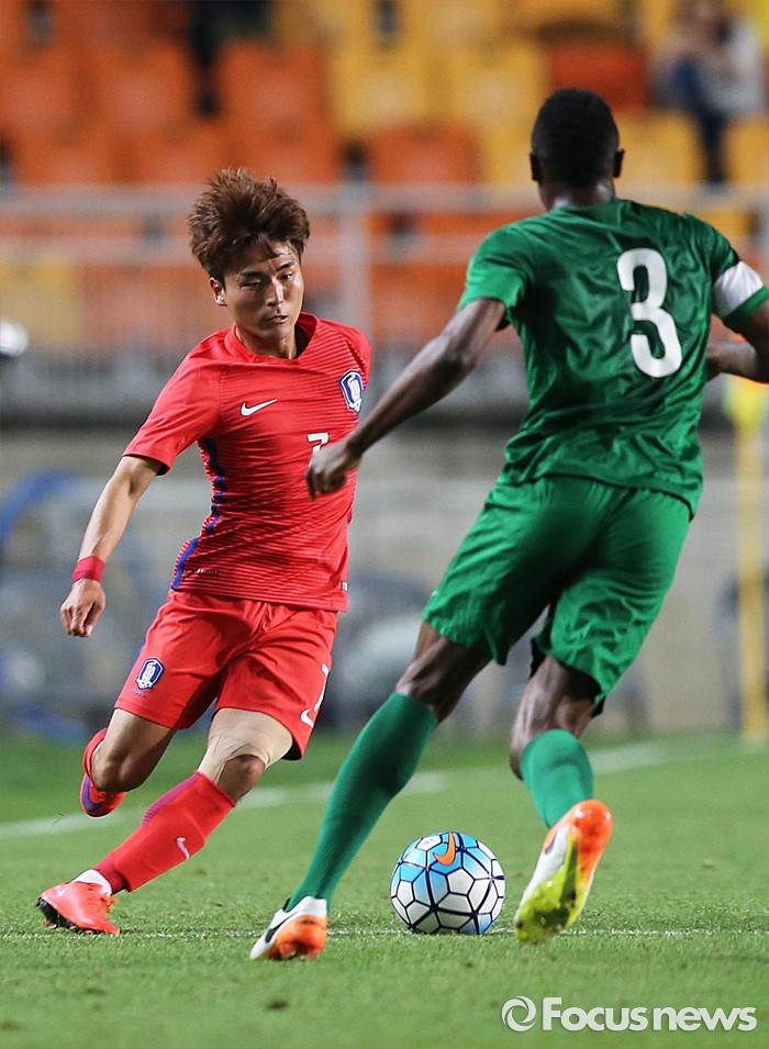 (수원=포커스뉴스) 2일 오후 경기 수원월드컵경기장에서 열린 2016 4개국 올림픽국가대표 축구대회 대한민국과 나이지리아의 경기에서 대한민국 문창진이 상대 선수와 볼 다툼을 하고 있다.