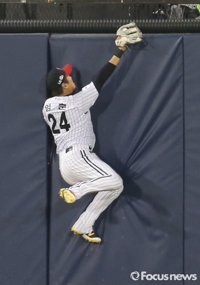 (서울=포커스뉴스) 2일 서울 잠실구장에서 열린 2016 프로야구 KIA-LG 경기 7회초 1사후 LG 중경수 임훈이 KIA 필의 뜬공 타구를 펜스에 부딪히며 잡고 있다.