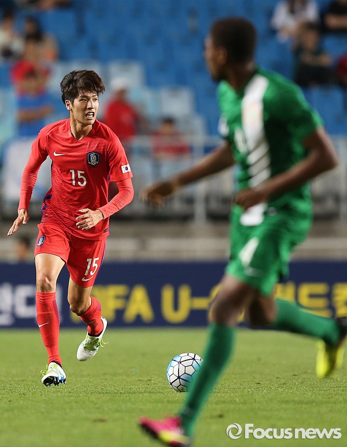 (수원=포커스뉴스) 2일 오후 경기 수원월드컵경기장에서 열린 2016 4개국 올림픽국가대표 축구대회 대한민국과 나이지리아의 경기에서 대한민국 최규백이 드리블을 하고 있다.