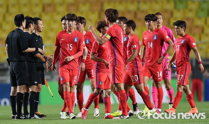 (수원=포커스뉴스) 2일 오후 경기 수원월드컵경기장에서 열린 2016 4개국 올림픽국가대표 축구대회 대한민국과 나이지리아의 경기에서 경기가 끝난 후 대한민국 선수들이 심판진들에게 인사하고 있다.