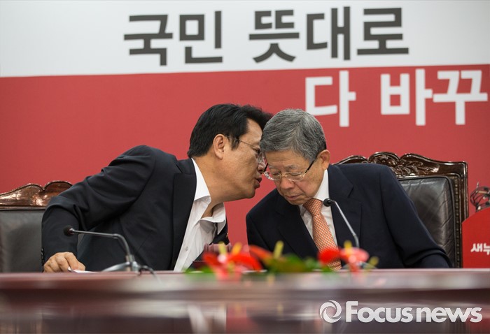 (서울=포커스뉴스) 김희옥(오른쪽) 새누리당 비상대책위원장과 정진석 원내대표가 3일 오전 서울 여의도 새누리당 당사에서 열린 비상대책위원회의에 참석해, 귀엣말을 하고 있다.