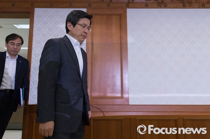 (서울=포커스뉴스) 3일 오전 서울 종로구 정부서울청사에서 열린 '미세먼지 관리특별대책 관계장관회의'에 황교안(오른쪽) 국무총리가 회의장으로 들어서고 있다.