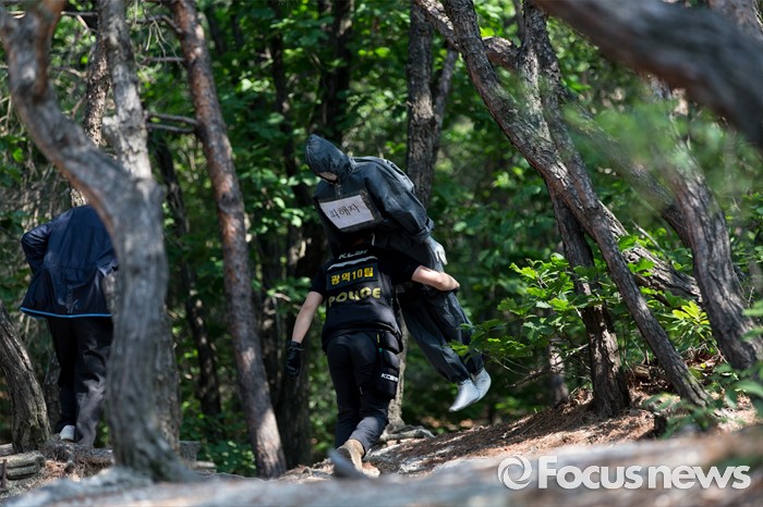 (서울=포커스뉴스) 지난 29일 서울 노원구 수락산 등산로에서 60대 여성을 살해한 피의자 김학봉(61)에 대한 현장검증이 열린 3일 오전 한 경찰 관계자가 피해자 마네킹을 들고 범행현장으로 향하고 있다.