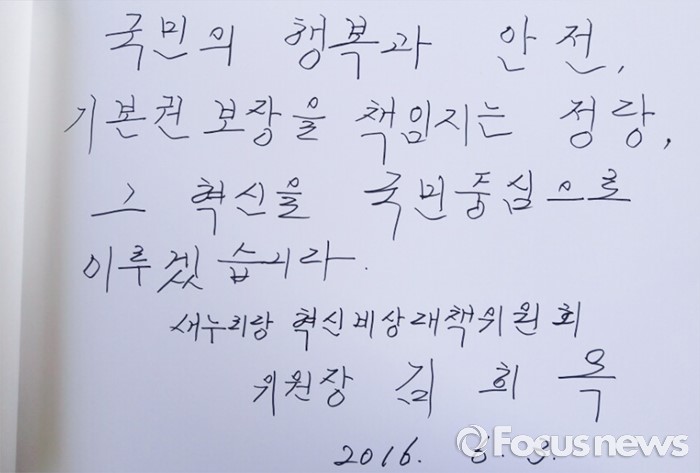 (서울=포커스뉴스) 김희옥 새누리당 혁신비대위원장이 3일 오전 동작구 국립서울현충원을 방문해 참배 후 방명록을 작성했다. 사진은 김 위원장이 남긴 방명록.