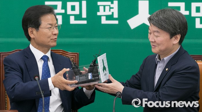 (서울=포커스뉴스) 3일 오전 서울 여의도 국회에서 열린 국민의당 최고위원회의에 참석한 안철수(왼쪽) 상임공동대표가 천정배 공동대표로부터 마이크를 전달받고 있다.