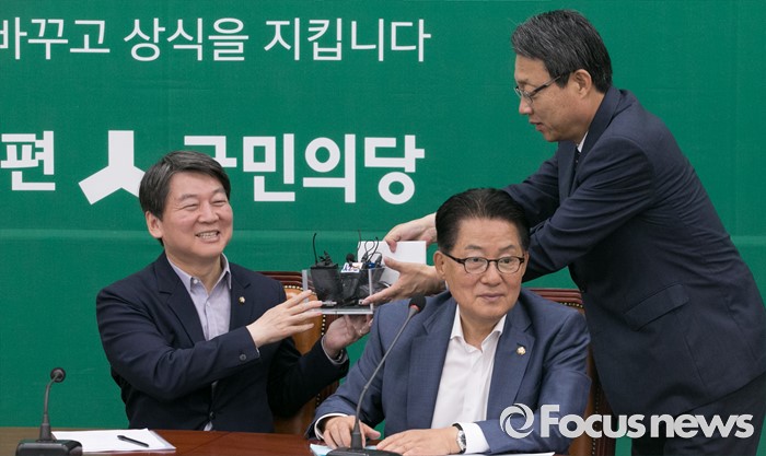 (서울=포커스뉴스) 3일 오전 서울 여의도 국회에서 열린 국민의당 최고위원회의에 참석한 안철수(왼쪽) 상임공동대표가 김성식(가운데) 정책위의장에게 마이크를 전하고 있다. 가운데는 박지원 원내대표.