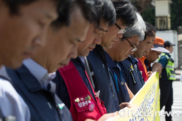 (서울=포커스뉴스) 3일 오전 서울 종로구 광화문광장에서 건설산업연맹원들이 남양주 지하철 폭발 및 붕괴사고에 대해 책임자 처벌과 건설현장 안전문제 대책 마련을 촉구하며 기자회견을 시작하기 앞서 희생자들을 위해 묵념하고 있다.