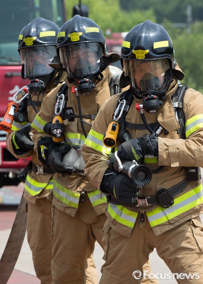 (청주=포커스뉴스) 3일 오전 충북 청주 무심천시민체육공원에서 열린 충북소방기술경연대회에 참가한 소방대원들이 기량을 겨루고 있다.