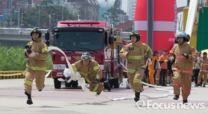 (청주=포커스뉴스) 3일 오전 충북 청주 무심천시민체육공원에서 열린 충북소방기술경연대회에 참가한 소방대원들이 기량을 겨루고 있다.