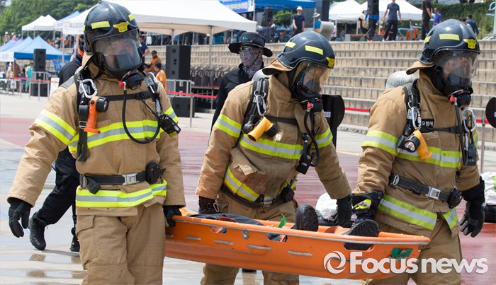 (청주=포커스뉴스) 3일 오전 충북 청주 무심천시민체육공원에서 열린 충북소방기술경연대회에 참가한 소방대원들이 기량을 겨루고 있다.