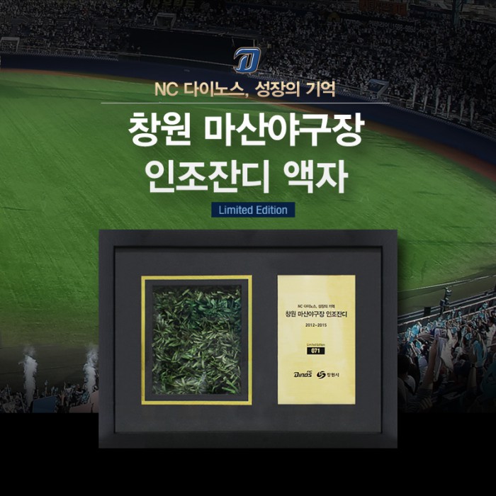 NC는 3일 "마산구장 그라운드를 천연잔디로 교체하며 이전까지 사용한 인조잔디를 활용한 기념액자를 출시했다"고 밝혔다. 기념액자는 마산구장 인조잔디 조각과 '성장의 기억' 문구, 한정판 숫자가 새겨진 동판으로 구성됐다.