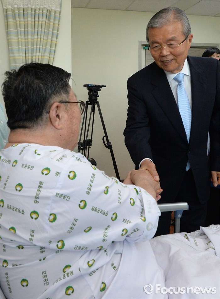 (서울=포커스뉴스) 김종인(오른쪽) 더불어민주당 비대위 대표가 현충일을 사흘 앞둔 3일 오후 서울 강동구 중앙보훈병원을 방문해 월남전에 참전했던 전백열(73, 상이 6급) 씨를 위문하고 있다.