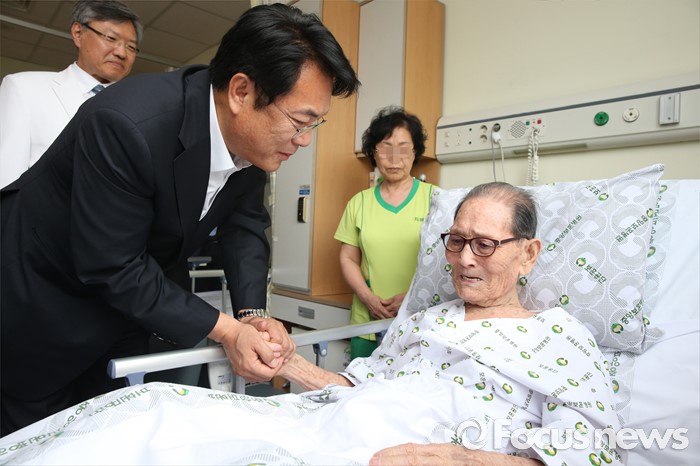 (서울=포커스뉴스) 정진석 새누리당 원내대표가 현충일을 사흘 앞둔 3일 오후 서울 강동구 중앙보훈병원을 방문해 6·25 참전용사를 위문하고 있다.