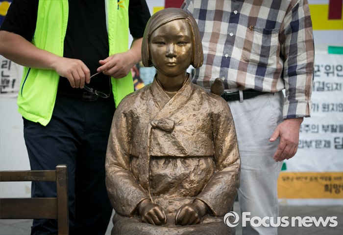 (서울=포커스뉴스) 3일 오후 서울 종로구 구 일본대사관 앞에서 농성 중인 한일 위안부 합의 폐기 및 소녀상 철거 반대 대학생행동 관계자들이 소녀상을 살펴보고 있다. 종로경찰서는 이날 낮 12시30분께 소녀상의 머리 부분을 약 40cm 길이의 망치로 수차례 내려친 A(33)씨를 현행범으로 체포해 조사하고 있다고 전했다.