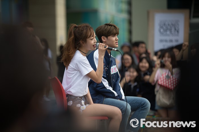 (서울=포커스뉴스) 3일 오후 서울 광진구 건대입구 스타시티 광장에서 가수 김소희(왼쪽)와 송유빈이 거리공연을 하고 있다.