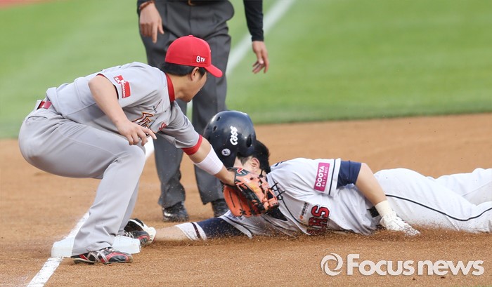 (서울=포커스뉴스) 3일 서울 잠실구장에서 열린 2016프로야구 SK-두산 경기 1회말 1사 2루에서 두산 2루주자 박건우가 민병헌 타석때 3루 도루를 시도하다 아웃되고 있다.