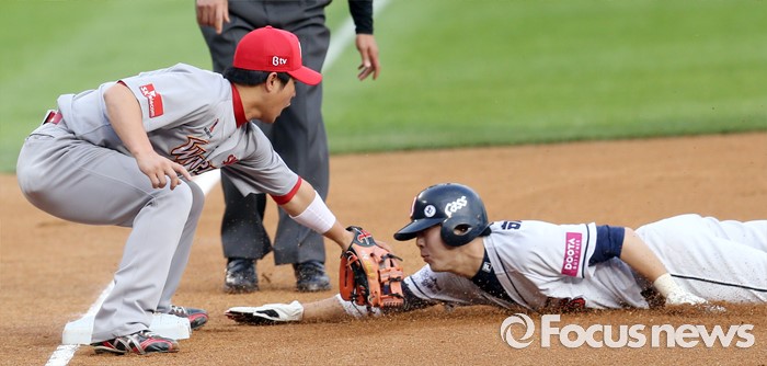 (서울=포커스뉴스) 3일 서울 잠실구장에서 열린 2016프로야구 SK-두산 경기 1회말 1사 2루에서 두산 2루주자 박건우가 민병헌 타석때 3루 도루를 시도하다 아웃되고 있다. SK 3루수는 최정.